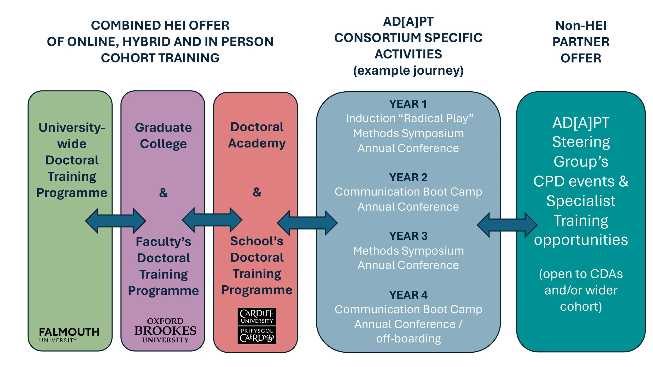 Our students will be able to chart their own path through the doctoral training opportunities across our three universities, or Higher Educational Institutions (HEIs), our partner organisations (non-HEIs), the AD[A]PT Consortium Specific Activities which will involve in person 2-3 day workshops and Annual Conferences over the course of their studies.